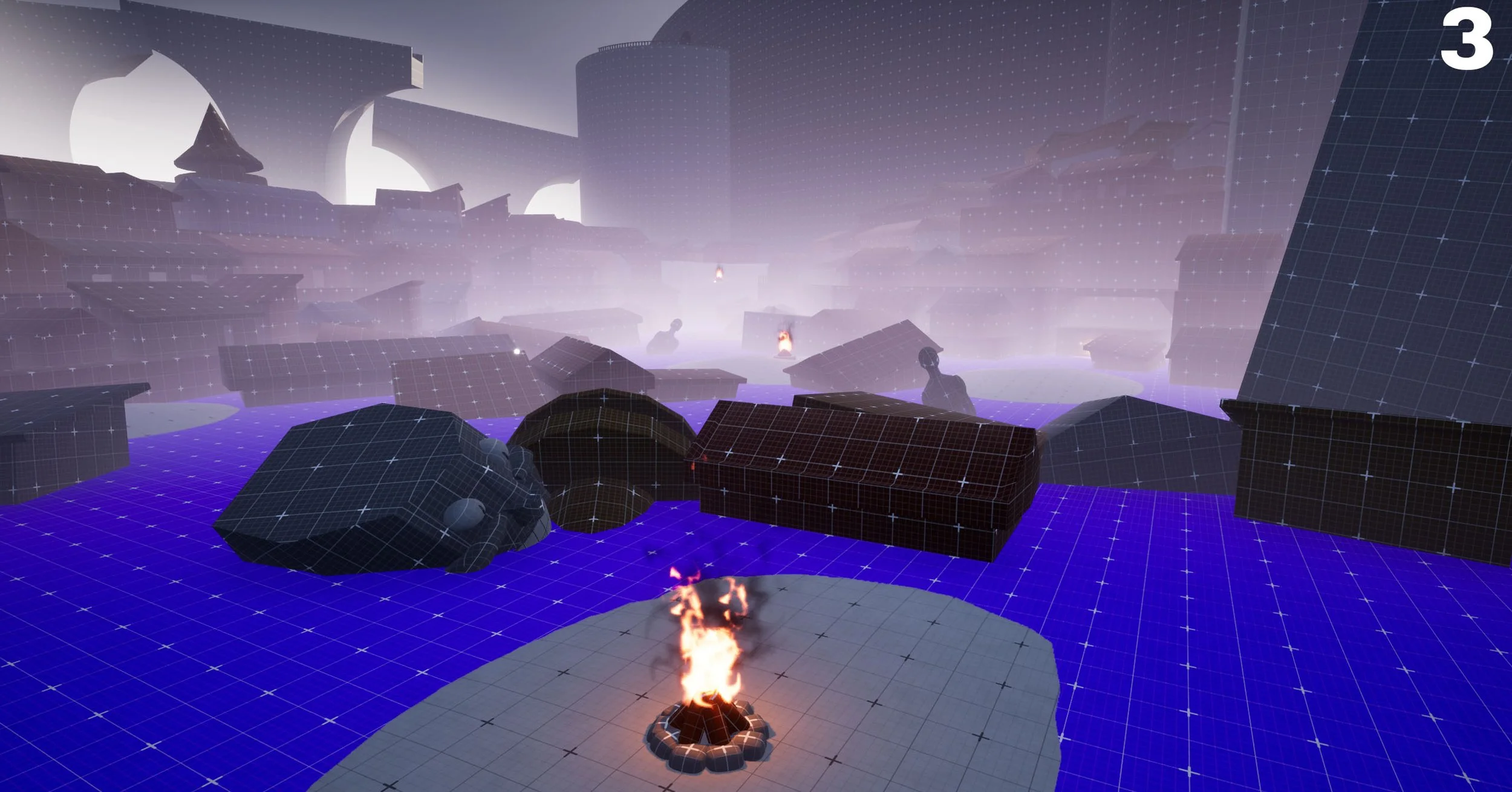 My goal for this level was to design and block out a DLC area for Dark Souls III set in the Londor story location, while also developing a gameplay pack to support it. I began by creating a Miro board to document the level's flow and collect both external and in-game references to establish its setting and narrative direction. When designing the initial top-down map, I drew on Dark Souls III’s design pillars and existing levels to shape the spaces, ranging from winding streets to open swamplands.